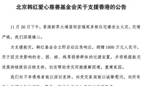 香港的火灾让人揪心,八栋大楼的猛然爆燃再次让大家明白水和火真是无情啊。唯一能让人觉得稍微踏实的是,世间还是有真情的。虽然香港这次火灾的真相还不清楚,但帮忙的人先到了。咱们来看看那些向我们同胞伸出援手的明星吧。韩红这个名字。